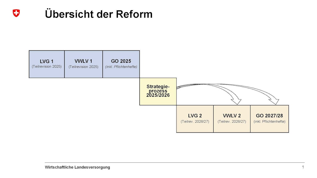 Die wirtschaftliche Landesversorgung in der Schweiz ist Aufgabe der Wirtschaft. Art. 102 der Bundesverfassung überträgt dem Bund einen Versorgungsauftrag unter anderem in schweren Mangellagen, denen die Wirtschaft nicht selbst zu begegnen vermag. Das Landesversorgungsgesetz (LVG) setzt diesen Auftrag um und stattet dabei den Bundesrat mit weitreichenden Kompetenzen aus. Die Wirtschaftliche Landesversorgung (WL), eine Partnerschaft von Staat und Wirtschaft, ist zuständig für die Vorbereitung und Umsetzung von Massnahmen gegen Mangellagen. Zur Stärkung der WL werden im Zuge einer Reform das Gesetz, die Geschäftsordnung und die Strategie überarbeitet.