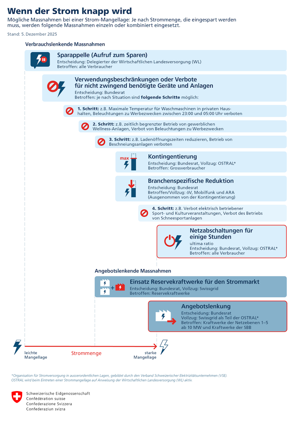 Der Bund kann die Verwendung elektrischer Energie für Anlagen, Geräte, Dienstleistungen oder Aktivitäten einschränken oder verbieten. Die Verwendungsbeschränkungen und Verbote erfolgen situationsgerecht in Eskalationsschritten, angefangen bei Komforteinschränkungen wie dem Verbot von Objektbeleuchtungen bis hin zu einschneidenden Massnahmen wie Betriebsschliessungen.