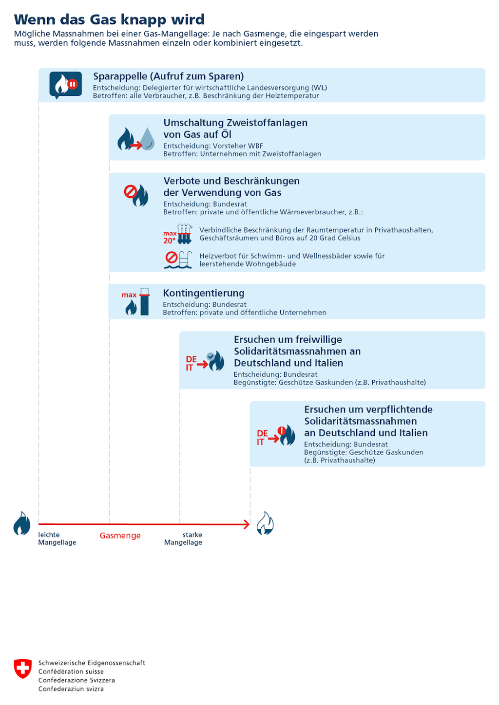 Ein Teil der Schweizer Unternehmen verfügt über Zweistoffanlagen, die mit Erdgas und mit Erdöl betrieben werden können. In einer Mangellage können diese Anlagen auf Ölbetrieb umstellen. Eine Umschaltung kann mittels Verordnung angeordnet werden.