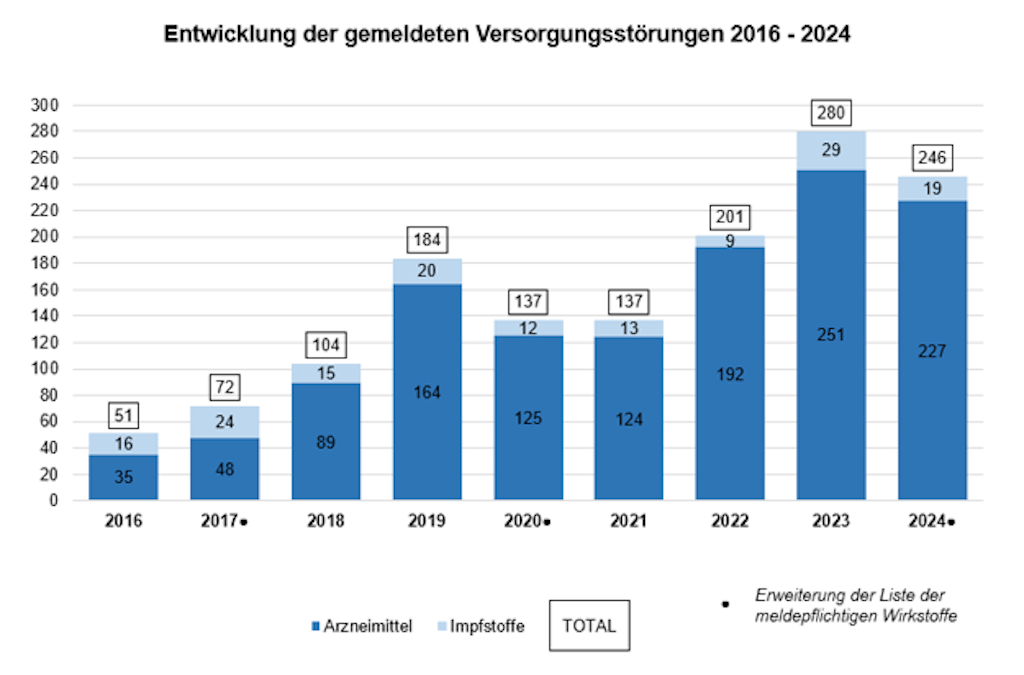 Die gemeldeten Versorgungsstörungen werden von der Meldestelle für lebenswichtige Humanarzneimittel analysiert und überwacht. Zur Überbrückung der Engpässe und zur Sicherstellung der Marktversorgung wurde bei Notwendigkeit Pflichtlagerware freigegeben. Weitere Informationen zur Versorgungslage bei lebenswichtigen Heilmitteln bietet die regelmässig aktualisierte Lagebeurteilung der Wirtschaftlichen Landesversorgung. Die genauen Zahlen zu den Versorgungsstörungen und Pflichtlagerbezügen im Jahr 2025 werden im nächsten Newsletter der Wirtschaftlichen Landesversorgung im Mai 2026 kommuniziert.