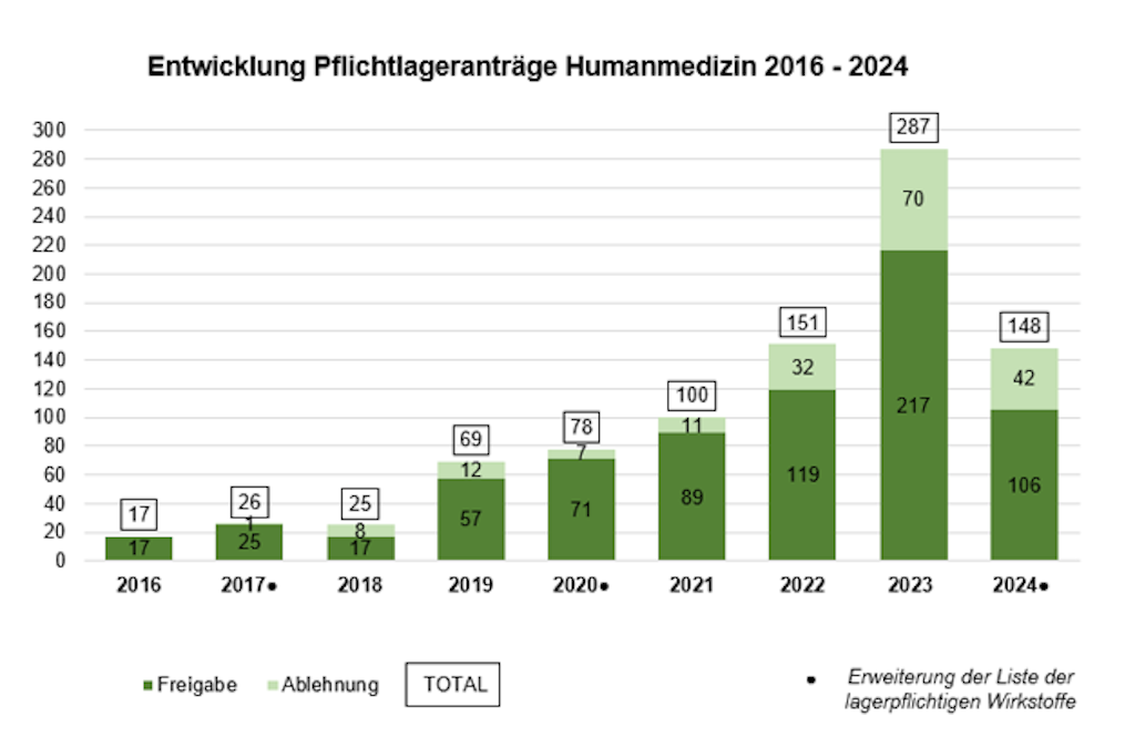 Engpässe bei meldepflichtigen Produkten und Anträge auf Freigabe von Pflichtlagerware prägten auch das laufende Jahr 2025. Die Versorgungssituation lebenswichtiger Arzneimittel wird weiterhin als kritisch eingeschätzt. Die Versorgungsstörungen betreffen den Spitalbereich wie auch den ambulanten Bereich. Kritisch ist die Versorgung aktuell bei gewissen Antibiotika. Hingegen hat es bei der Versorgung der Impfstoffe eine leichte Entspannung gegeben.
