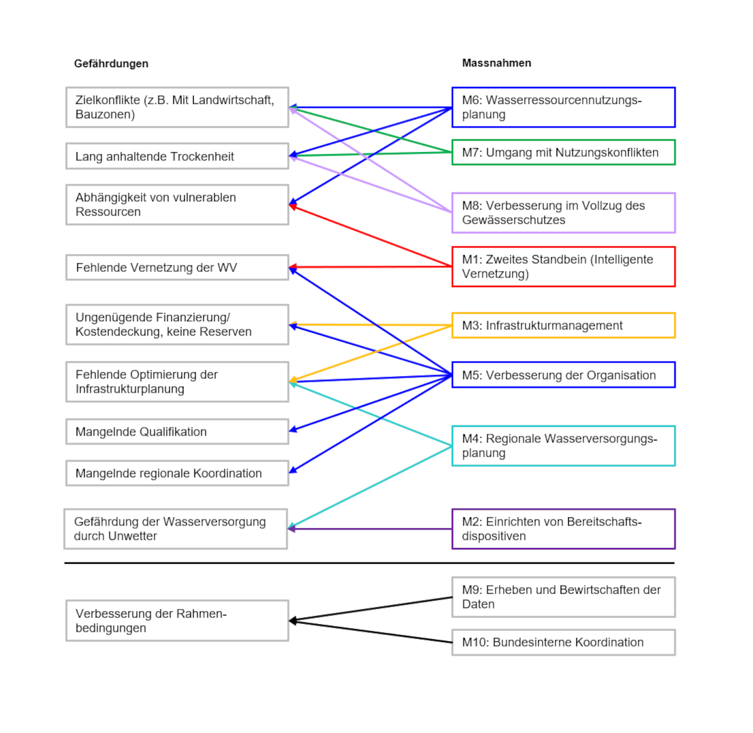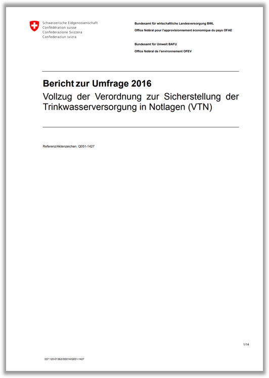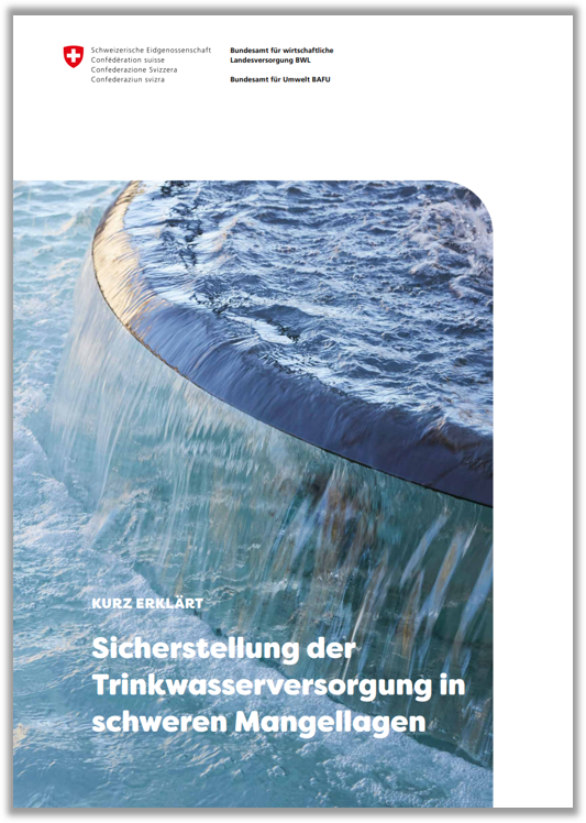 Damit Trinkwasser immer in der gewünschten Qualität und Menge verfügbar ist, braucht es resiliente und sichere Wasserversorgungssysteme. Diese Versorgungssysteme werden in der Regel von den Gemeinden betrieben, von den Kantonen beaufsichtigt und vom Bund im Sinne der wirtschaftlichen Landesversorgung mit der Verordnung über die Sicherstellung der Trinkwasserversorgung in schweren Mangellagen (VTM), welche seit dem 1. Oktober 2020 in Kraft ist, ergänzend geregelt.