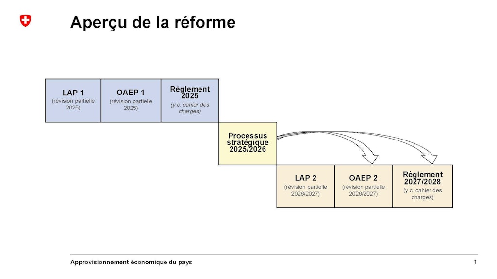 En Suisse, l’approvisionnement économique du pays incombe aux milieux économiques. L’art. 102 de la Constitution fédérale donne mandat à la Confédération d’assurer l’approvisionnement, notamment en cas de grave pénurie à laquelle l’économie n’est pas en mesure de remédier par ses propres moyens. La loi sur l’approvisionnement du pays (LAP) met en œuvre ce mandat et confère au Conseil fédéral de vastes compétences. L’Approvisionnement économique du pays (AEP), fruit d’un partenariat entre l’État et le secteur privé, est une organisation chargée de préparer et d’appliquer des mesures visant à pallier les pénuries. La LAP, ainsi que le règlement et la stratégie de l’AEP sont en cours de révision dans le cadre d’une réforme visant à renforcer l’organisation.