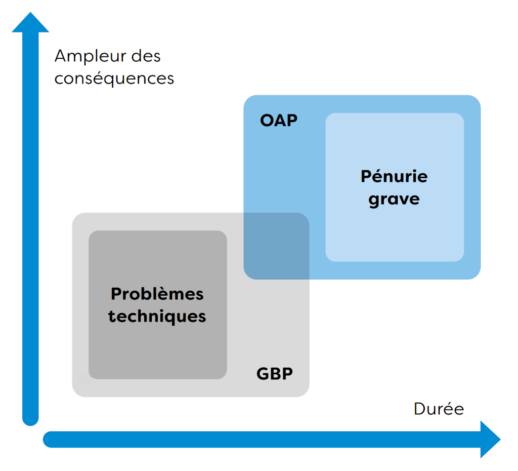 S’agissant des pénuries graves, les analyses des risques et dangers publiées par l’Office fédéral de la protection de la population (OFPP) et les cantons soulignent par ailleurs l’importance de menaces telles que les cyberattaques, les sabotages, les phénomènes météorologiques extrêmes (intempéries, inondations, p. ex.), les séismes, les pandémies, les pannes du réseau de téléphonie mobile, les black-out et les pénuries d’électricité.
