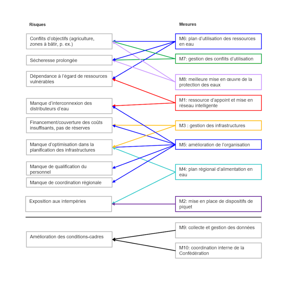 L’OAP reprend bon nombre de ces mesures, dont elle confirme l’importance et l’urgence. Toutefois, étant donné que l’ordonnance se concentre sur les situations de pénurie grave, elle ne mentionne pas explicitement certaines mesures préventives essentielles, comme la protection des eaux ou l’atténuation des conflits d’utilisation. En vue d’un approvisionnement en eau sûr et résilient, il convient donc de s’appuyer également sur le guide des bonnes pratiques et une analyse exhaustive des dangers1.