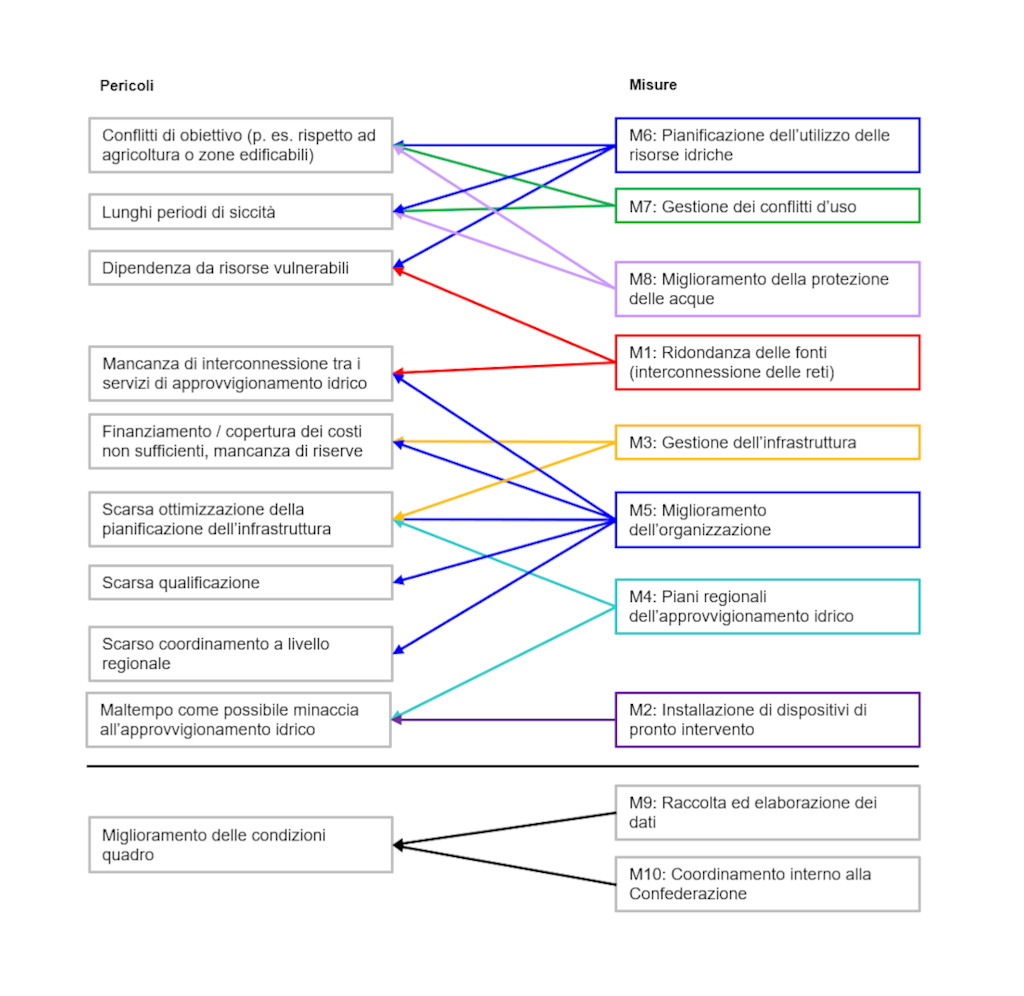 Molte di queste misure sono contenute nell’OAAP, che ne conferma l’urgenza e l’importanza. Tuttavia, poiché l’ordinanza si concentra sulle situazioni di grave penuria, non menziona esplicitamente alcune misure preventive fondamentali come la protezione delle acque o la mitigazione dei conflitti d’uso. Per un approvvigionamento idrico nazionale sicuro e resiliente, le disposizioni dell’OAAP, specifiche per le situazioni di crisi, vanno integrate con la buona prassi procedurale e un’analisi dei pericoli1 integrale.
