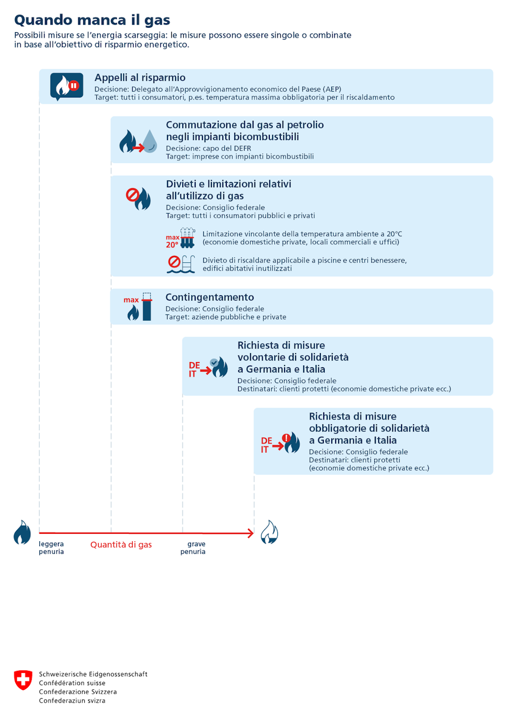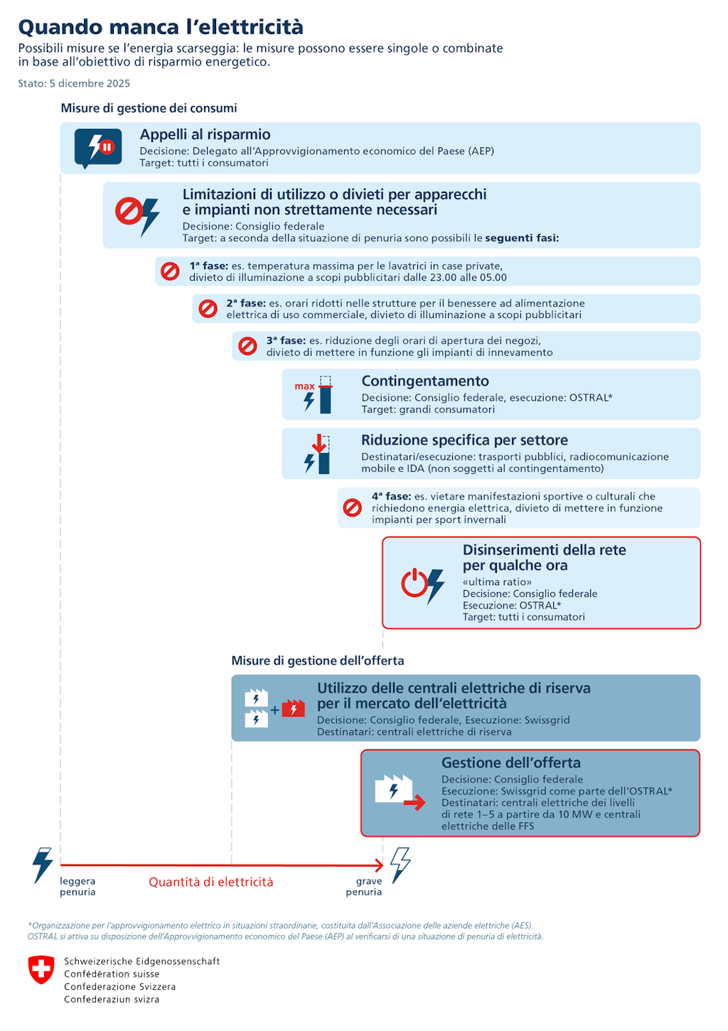 La Confederazione può limitare o vietare l’impiego di energia elettrica per determinati impianti, apparecchi, servizi o attività. Si tratta di una procedura che avviene per gradi (fasi di escalation), in base alle circostanze, partendo da una limitazione dei comfort, come il divieto di illuminazione architetturale degli edifici, fino ad arrivare a misure più drastiche come la chiusura delle aziende.